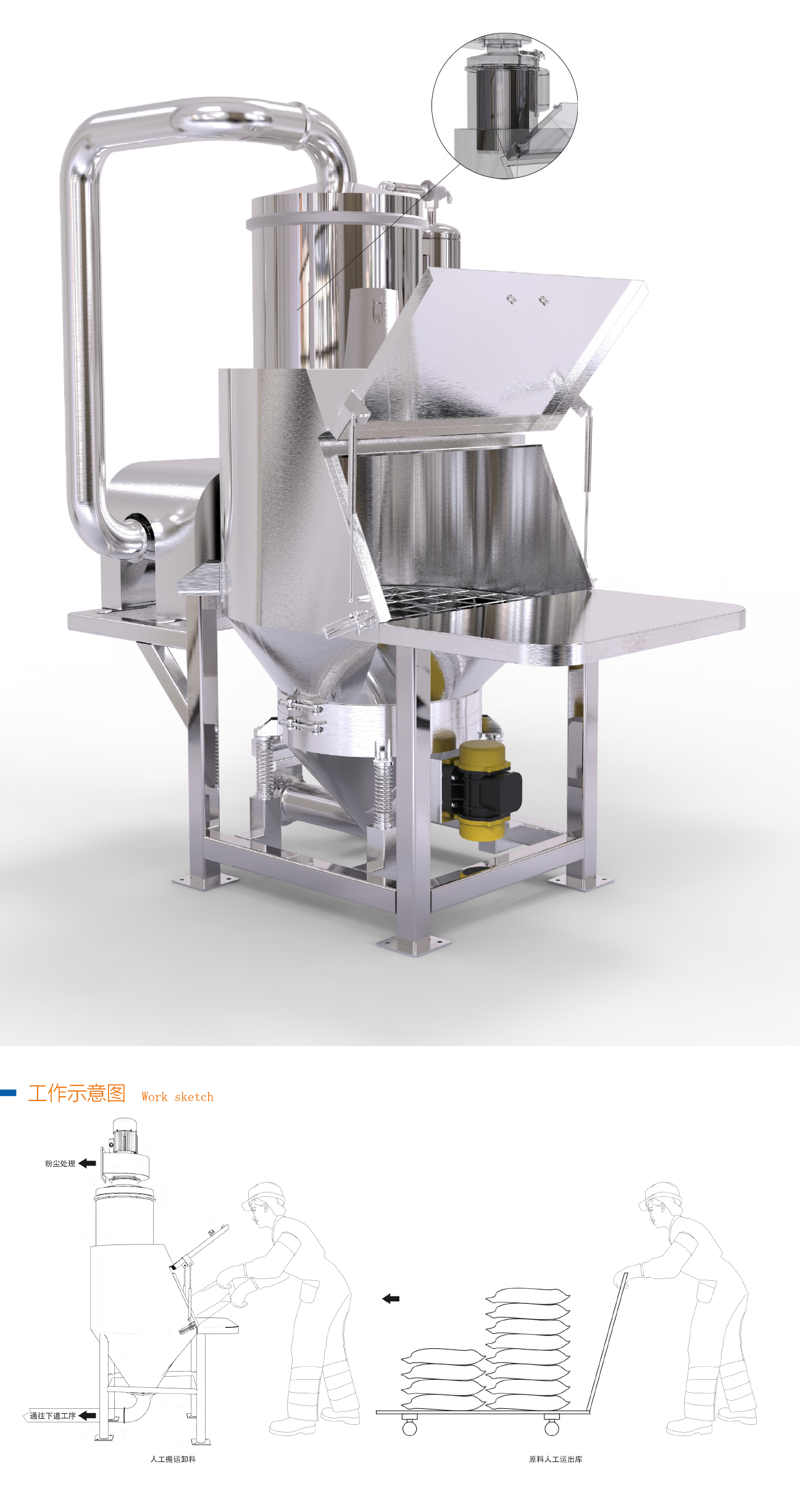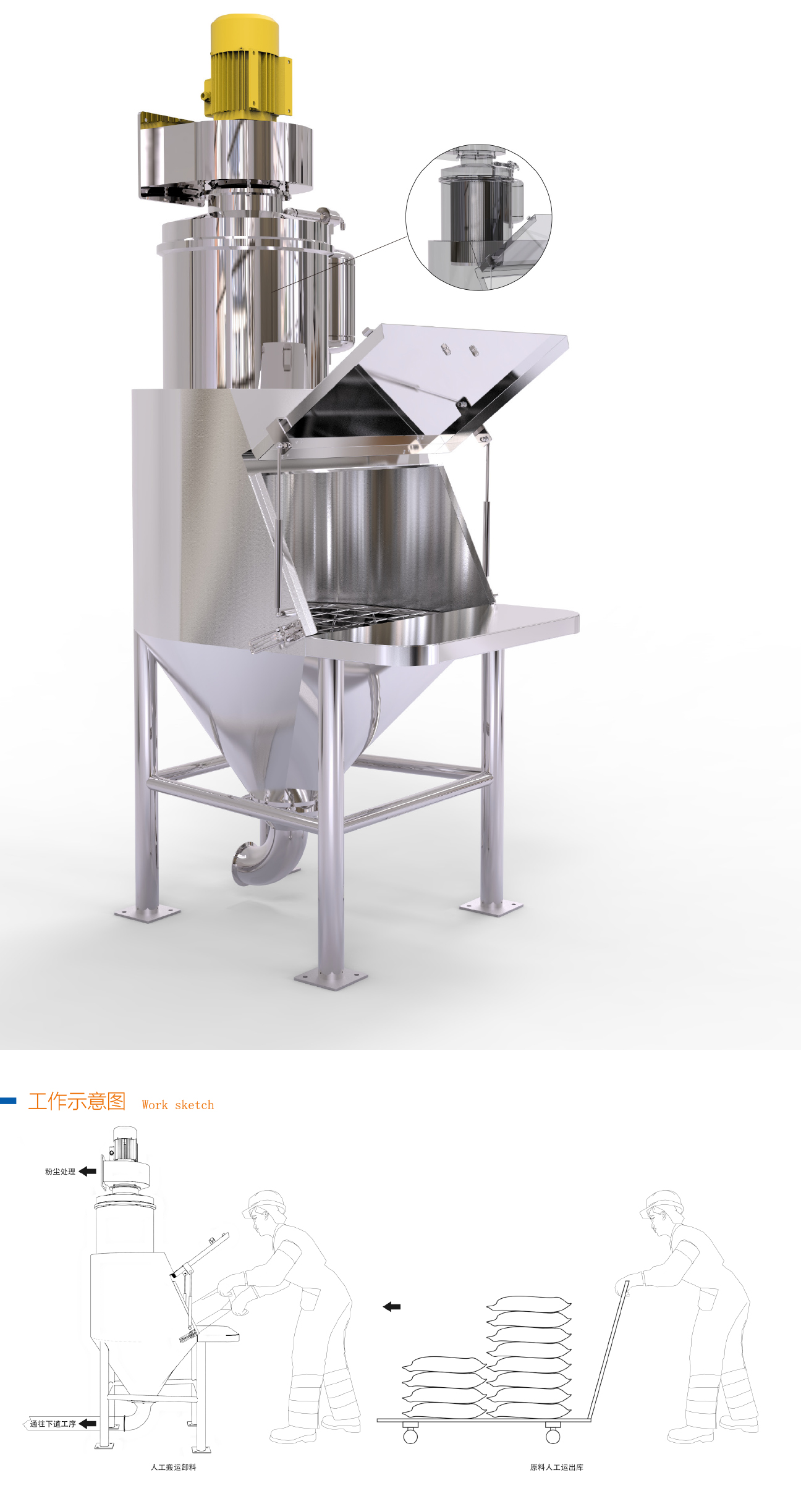 此設備采用新型集塵裝置,并配備振動器輔助卸料,使整個投料過程中無粉塵、順暢、不浪費物料,是目前國內最為理想的人工投料站設備。