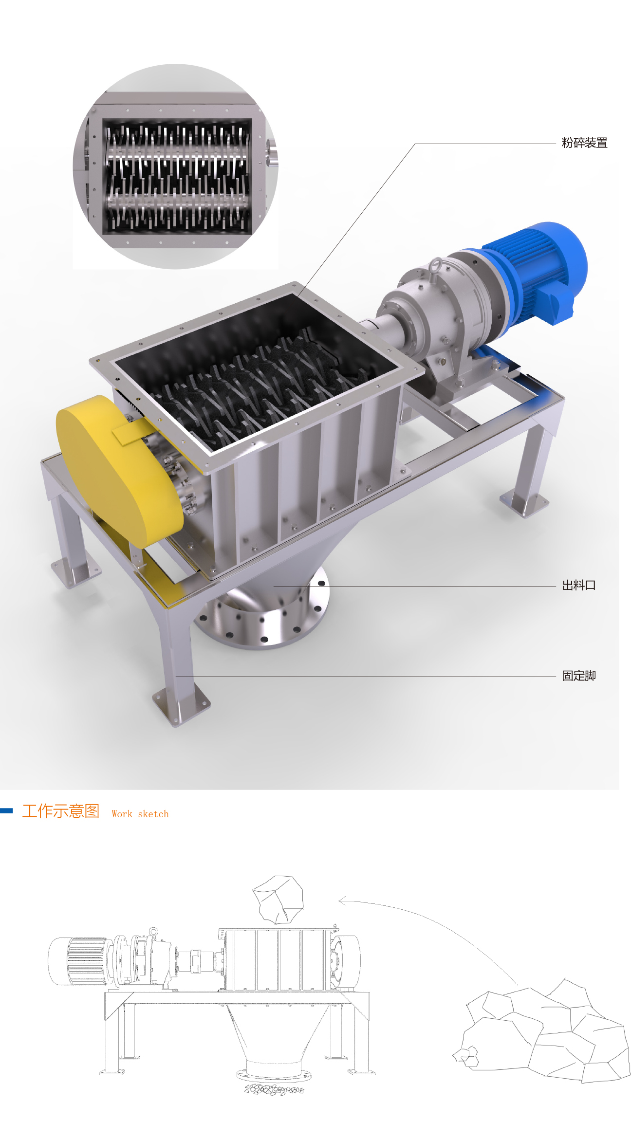 此設備用于改善物料的狀態,一是將較大結塊物料加工成大小相當的小顆粒,二是將較大快裝原理加工成大小相當的小粒料,可以通過更換不同間距的刀片,調整粉碎后物料的顆粒大小,在食品、化工、鋰電等行業使用較多,主要用于噸袋內結塊物料的破碎。