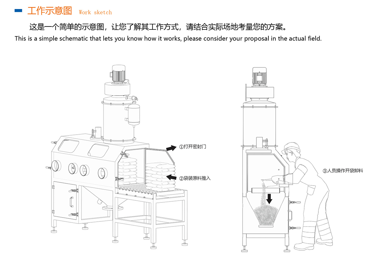 3、在整個(gè)卸料過(guò)程中,全密閉操作,操作人員不和物料有任何接觸空料袋集中回收,防止袋內(nèi)殘余物料外泄;